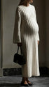 Feminine and elegant, our Apricot Solid Maternity Sweater Maxi Dress is crafted to shine across moments—from daily outings to special dates. Soft knit ribbed fabric fits closely yet gently, wrapping your bump in comfort while adding subtle texture, and the classic round neck enhances simplicity, paired with long sleeves that lock in warmth for cooler days. The relaxed yet sleek silhouette flatters your pregnancy curves naturally, letting you move with ease whether you’re at a baby shower, dinner, or posing for photos. Ideal for photoshoots, baby showers, daily wear, going out, nights out, dinners, and dates, this dress blends knit coziness with elegant design to capture your radiant pregnancy glow. Embrace graceful maternity style with this wonderful must-have!