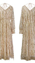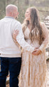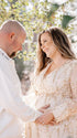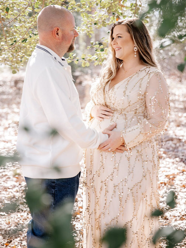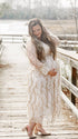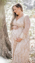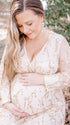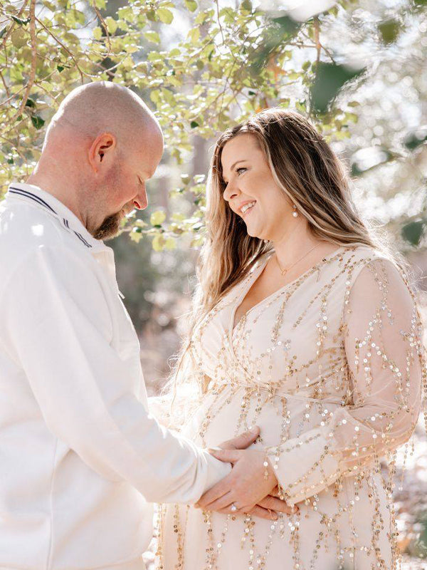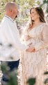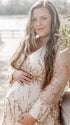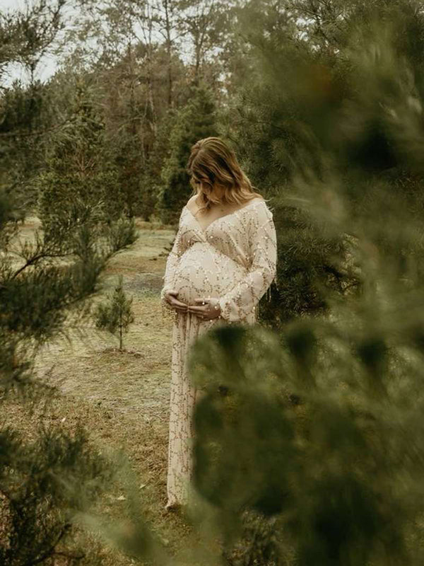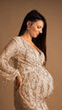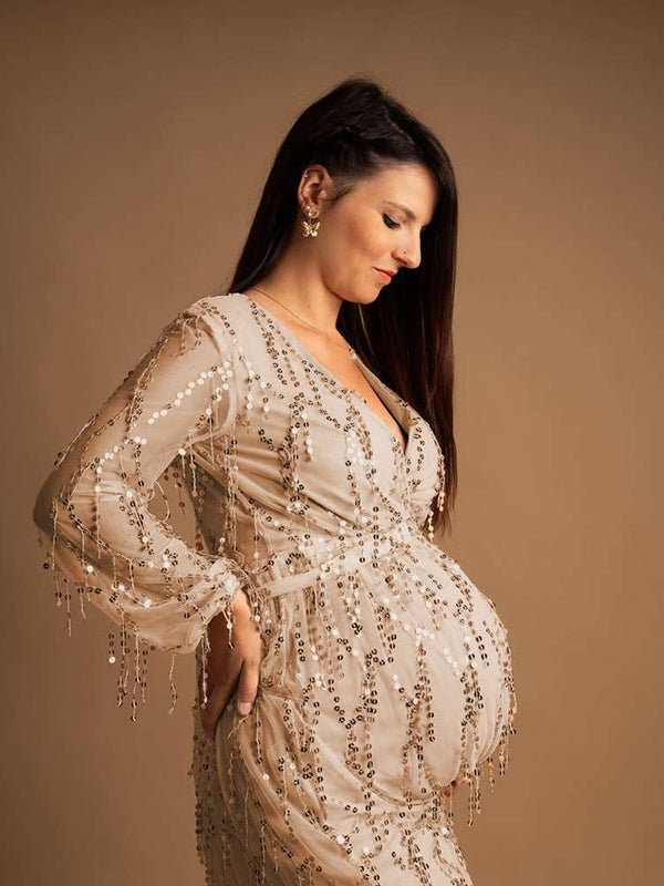 Momsmood Apricot Sequin Tassel Tulle Ruched Cross Chest Multi Way Tie Back V-neck Elegant Boho Photoshoot Maternity Maxi Dress