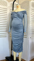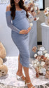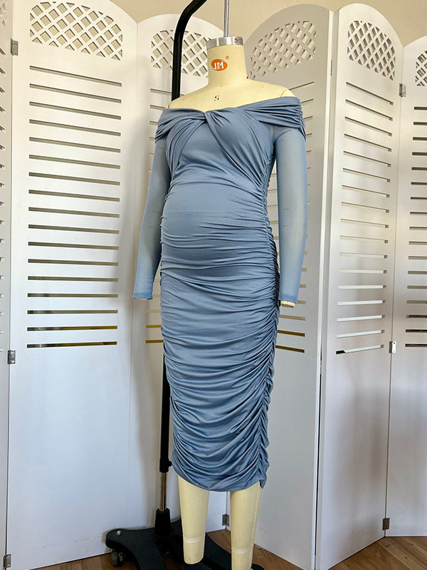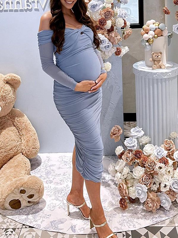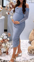 Momsmood Blue Ruched Off Shoulder Cross Chest Bodycon Elegant Wedding Guest Maternity Photoshoot Midi Dress