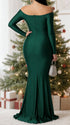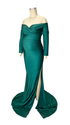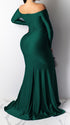 Leisurely yet glamorous, this Green Maternity Evening Gown is crafted from stretchy, soft fabric for all-day comfort. Boasting an off-the-shoulder V-neck, long sleeves, thigh-high slit and flattering fishtail bodycon silhouette, its solid green hue exudes elegance and is ideal for Christmas events. Floor-length and slim-fit, it delivers a showstopping look that shines for parties, dinners, photoshoots, honeymoons and festive gatherings—blending maternity-friendly stretch with formal prom-ready charm for unforgettable holiday moments!