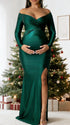 Momsmood Christmas Green Off Shoulder Long Sleeve High Split Bodycon Solid Baby Shower Evening Gown Maternity Maxi Dress
