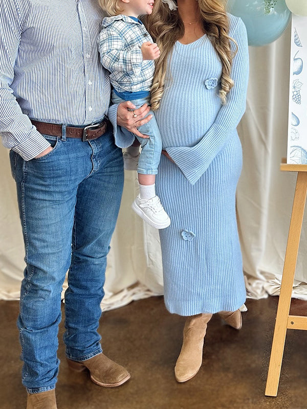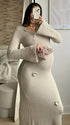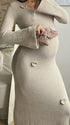 Effortlessly luxurious, our Maternity Maxi Dress elevates your pregnancy radiance across every elegant occasion. Crafted with sumptuous knit, it features exquisite 3D flower embellishments, a flattering V-neck, and flowing flare sleeves, paired with a contouring bodycon fit that flatters curves gently. The design adapts to your growing bump, blending timeless elegance with romantic allure—perfect for photoshoots, baby showers, weddings, and dates. This wardrobe showstopper shines: pair with stiletto heels for red-carpet glamour or satin flats for understated sophistication!