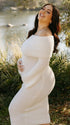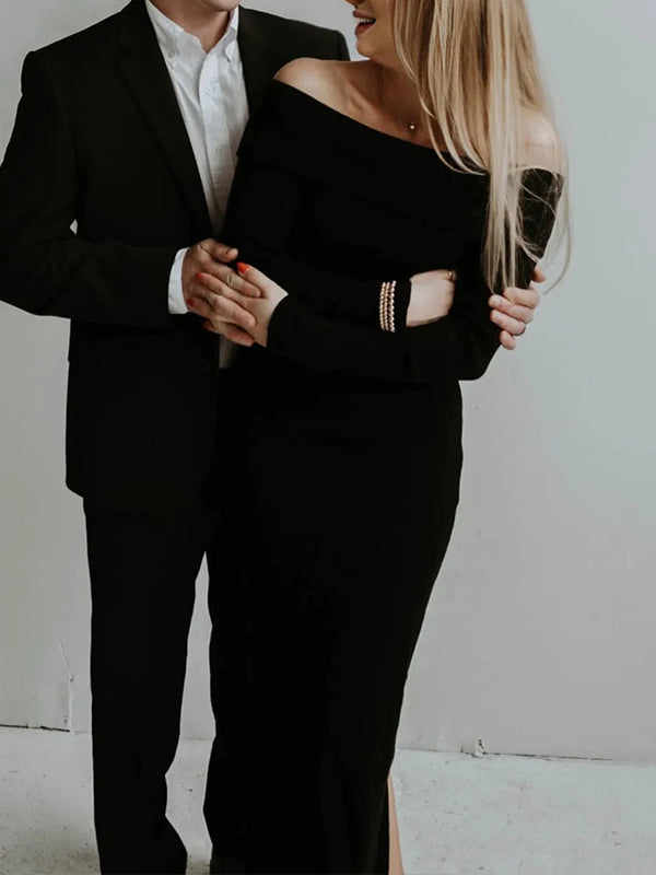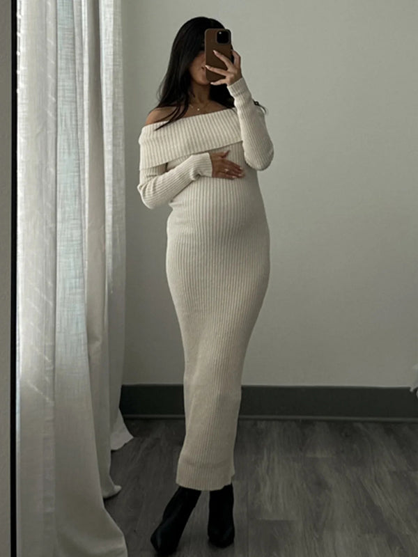 This elegant solid-color maternity sweater maxi dress blends bandeau and backless designs with a chic boat neck and long sleeves. Crafted from soft acrylic, the knit texture offers cozy comfort, while the off-shoulder silhouette and bodycon mermaid fit gently accentuate curves. Versatile enough for daily wear, casual outings, dinners, and baby showers, it balances sophistication with ease.