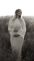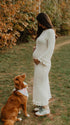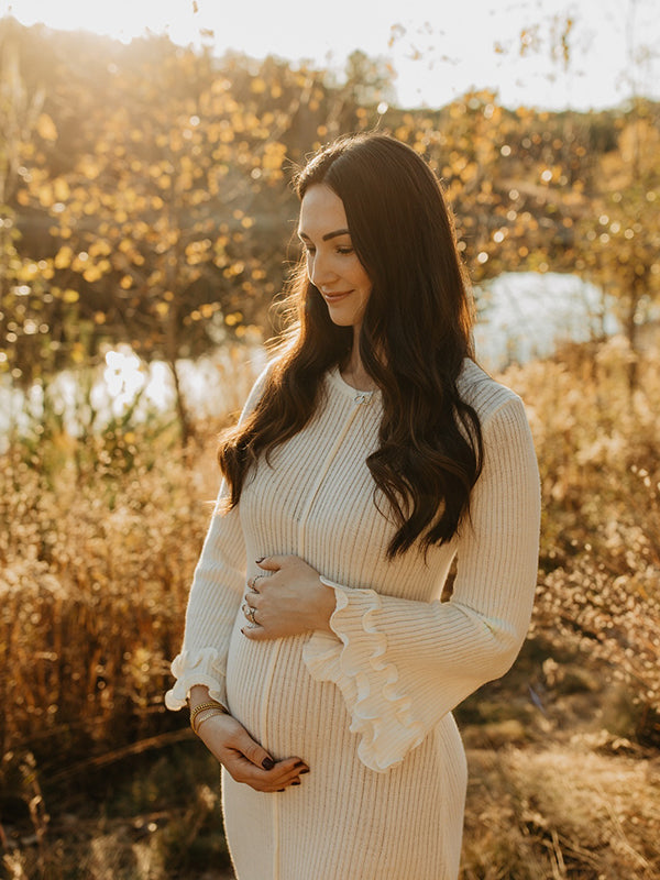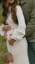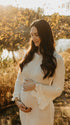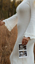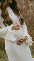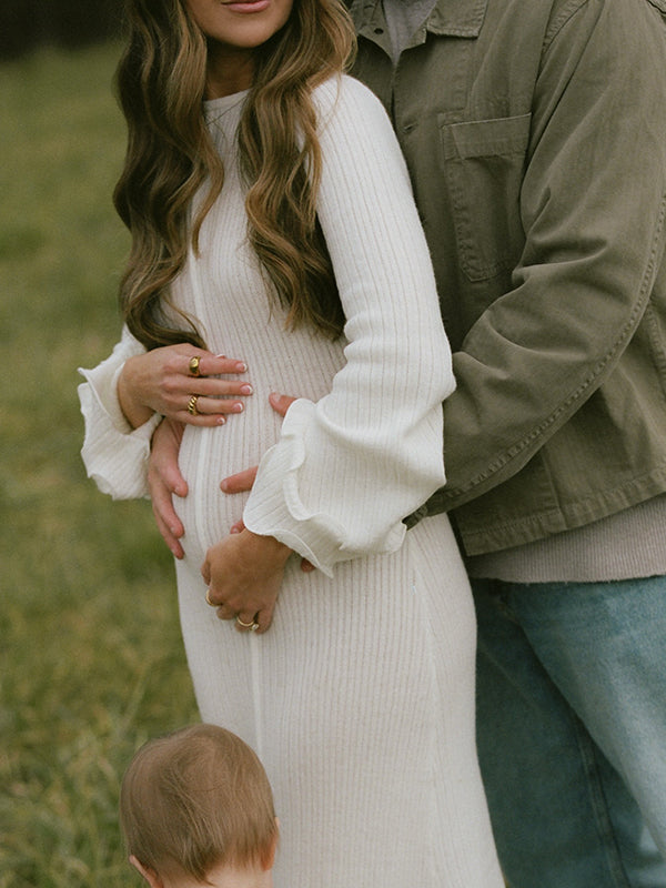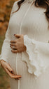 Momsmood White Knit Pleated Tie Back Ruffle Falbala Frill Hem Backless Big Swing Elegant Cocktail Party Gown Maternity Photoshoot Baby Shower Maxi Dress