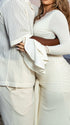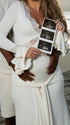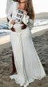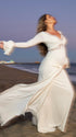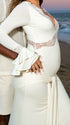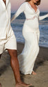 Elegant and ornate, our White Lace Ruffle Maternity Maxi Dress fits a wide range of occasions—from photoshoots, baby showers and gender reveals to parties, cocktails, wedding guest looks, evenings, formal events, clubs, daily outings, nights out, dinners, dates, babymoons, vacations and beaches—suiting spring, summer and autumn. Its V-neck adds subtle allure, while long flare sleeves bring soft, romantic movement, enhancing the dress’s elegant silhouette. Layered details shine: delicate lace injects luxury, ruffles add playful charm, ruched elements gently hug pregnancy curves, draped fabric creates a flowing vibe, and the big swing skirt brings lively dynamism—perfect for twirling at parties or posing for photos. The solid white hue exudes timeless purity, complementing casual beach backdrops and formal wedding decors alike. It balances grace with comfort, letting you stand out in every moment— a must-have for elegant multi-scene maternity wardrobes!